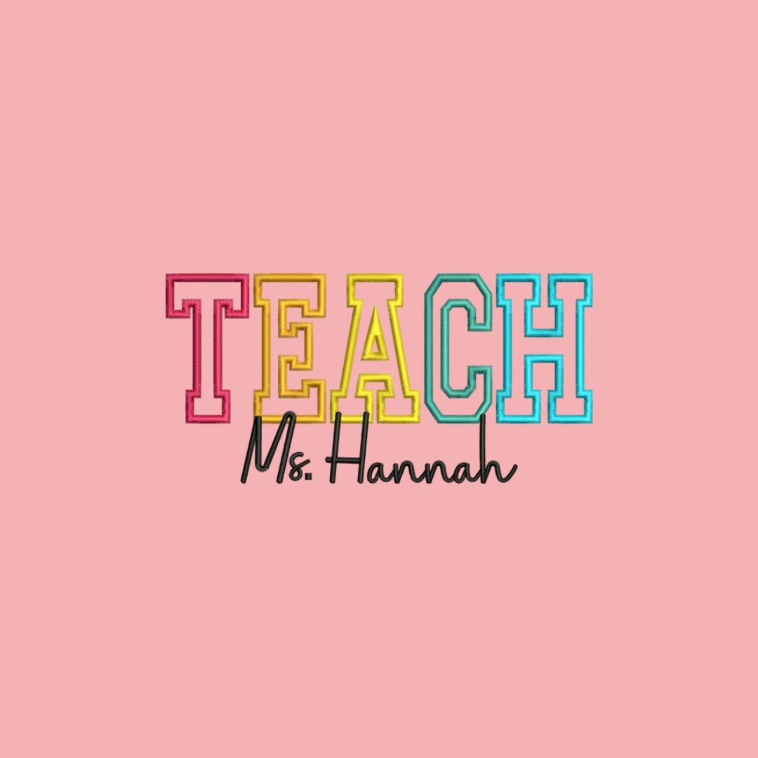 Celebrate the amazing educators in your life with this vibrant personalized TEACH embroidery design! Perfect for custom gifts, apparel, and teacher appreciation projects.