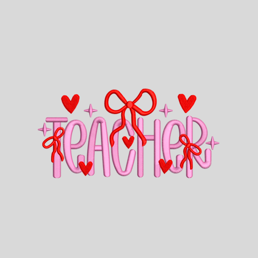 Show your gratitude to educators with this Teacher Embroidery Design, featuring bold pink lettering adorned with red bows, hearts, and sparkles. This playful yet elegant design is perfect for creating thoughtful gifts, classroom decorations, or custom apparel for teachers.